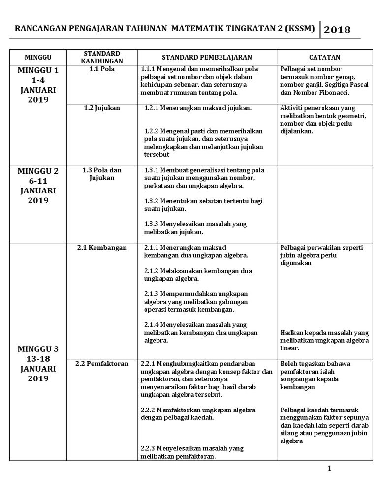 Rancangan Pengajaran Tahunan Matematik Tingkatan 2 2018