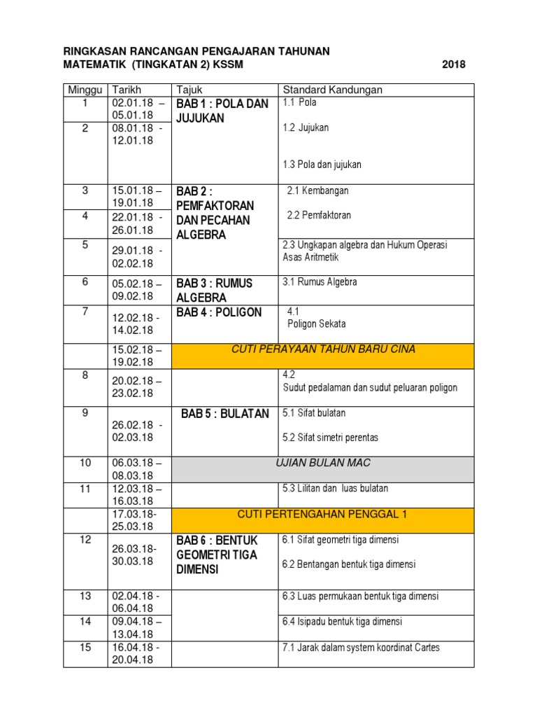 Ini Ialah RPT Matematik Tingkatan 2 soalan peperiksaan awal tahun ujian mac 2018 kssm tingkatan 2 di ambil dari post berikut. Rancangan Pengajaran Tahunan RPT 2018 Tingkatan 5 medium Perkongsian Bestari Warga Pendidikan Malaysia. Rancangan pengajaran ini telah disediakan dan dirangka bagi membolehkan semua.